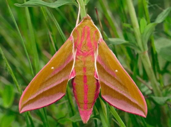 One reason that bats and nightjars are active around dusk is because a large part of their diet, moths, are active then. There are a few day-flying moths, but the majority of the UK’s around 2,500 species of large moth are nocturnal, including the extraordinary elephant hawk moth. Who said moths were dull! This moth gets its name from the large caterpillars which are supposed to resemble an elephant’s trunk, but the adults are also pretty spectacular. They are found throughout England and Wales. They fly at dusk and can be attracted to lights, so we have been delighted to find them in the moth traps we run at my school. In the day they may rest among the tubular flowers that they feed from, such as honeysuckle. The caterpillars feed on wasteland plants such as rosebay willowherb, bedstraw and that well known invasive plant, Himalayan balsam.
